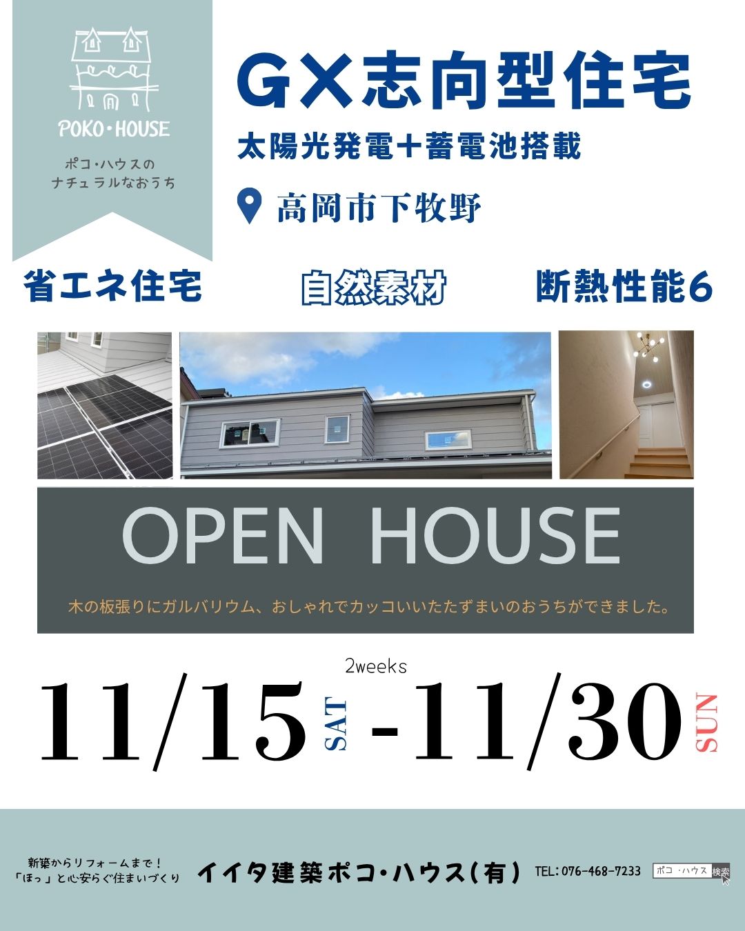 高岡市下牧野にて、ポコ・ハウスの完成見学会を開催いたします!