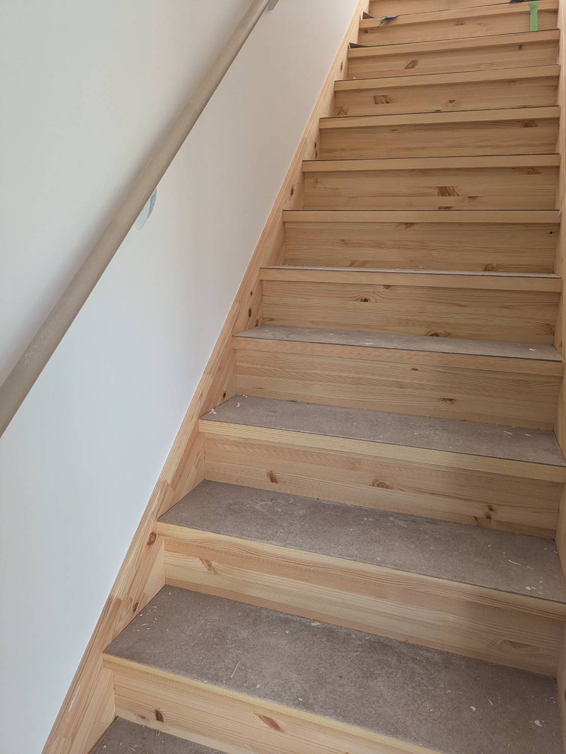 手すりが付き、階段も出来上がりました!まだ工事中なので養生の板が張られています。