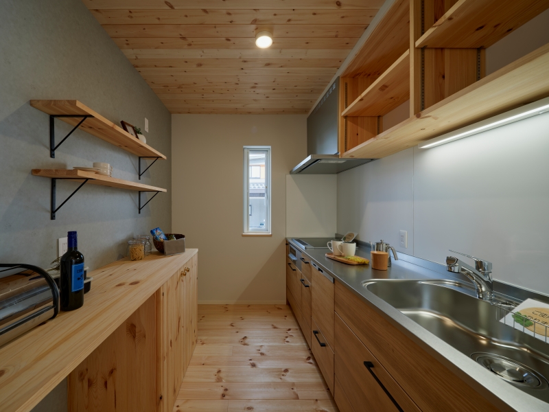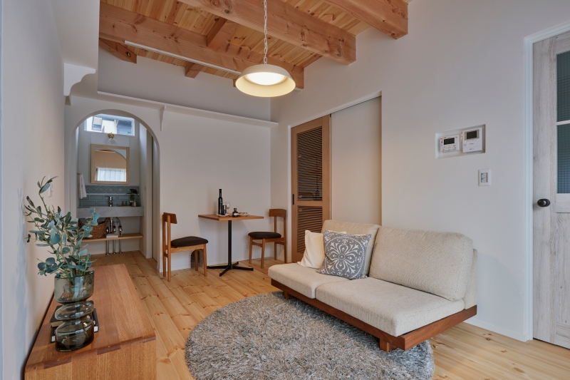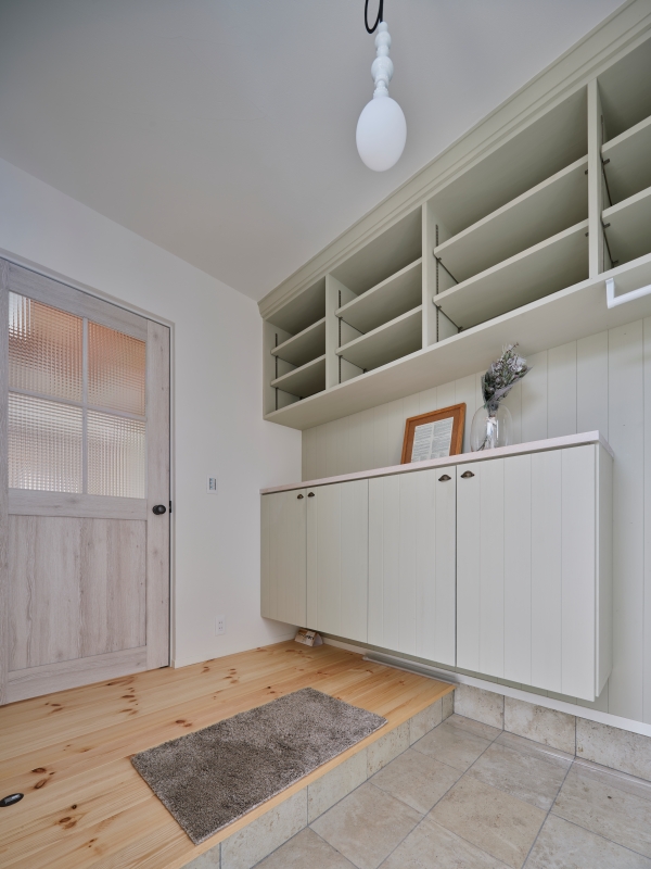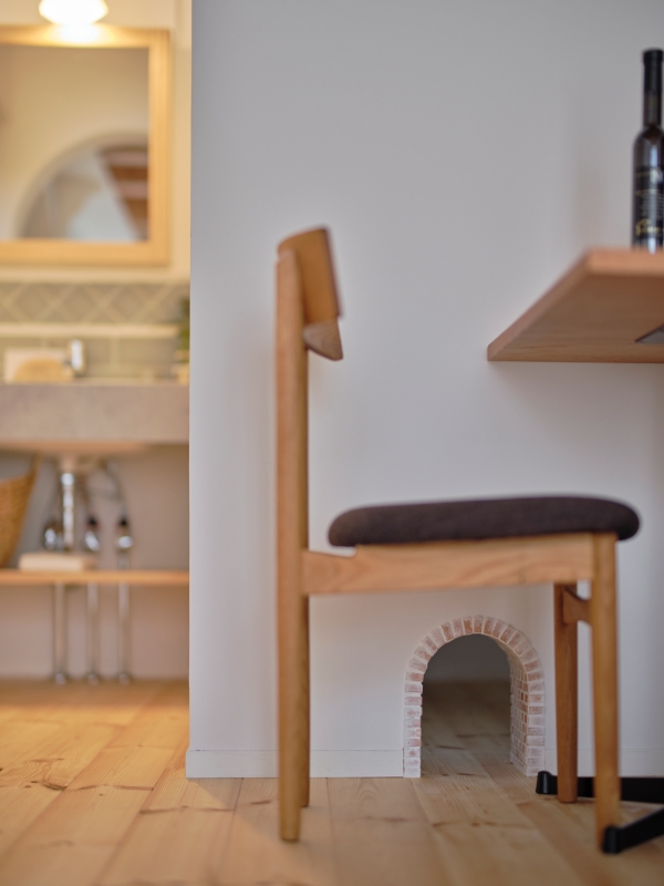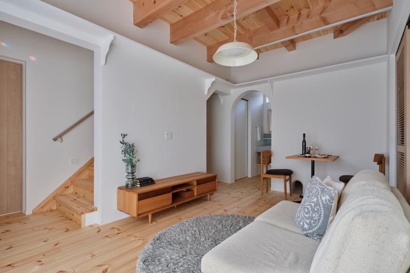 白の内装に塗り壁をふんだんに使用し、無垢材が合わさったやさしく暖かいお家