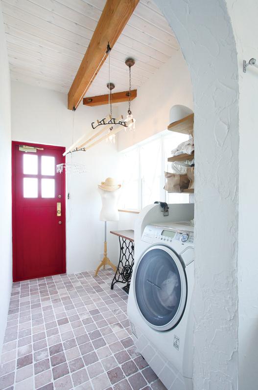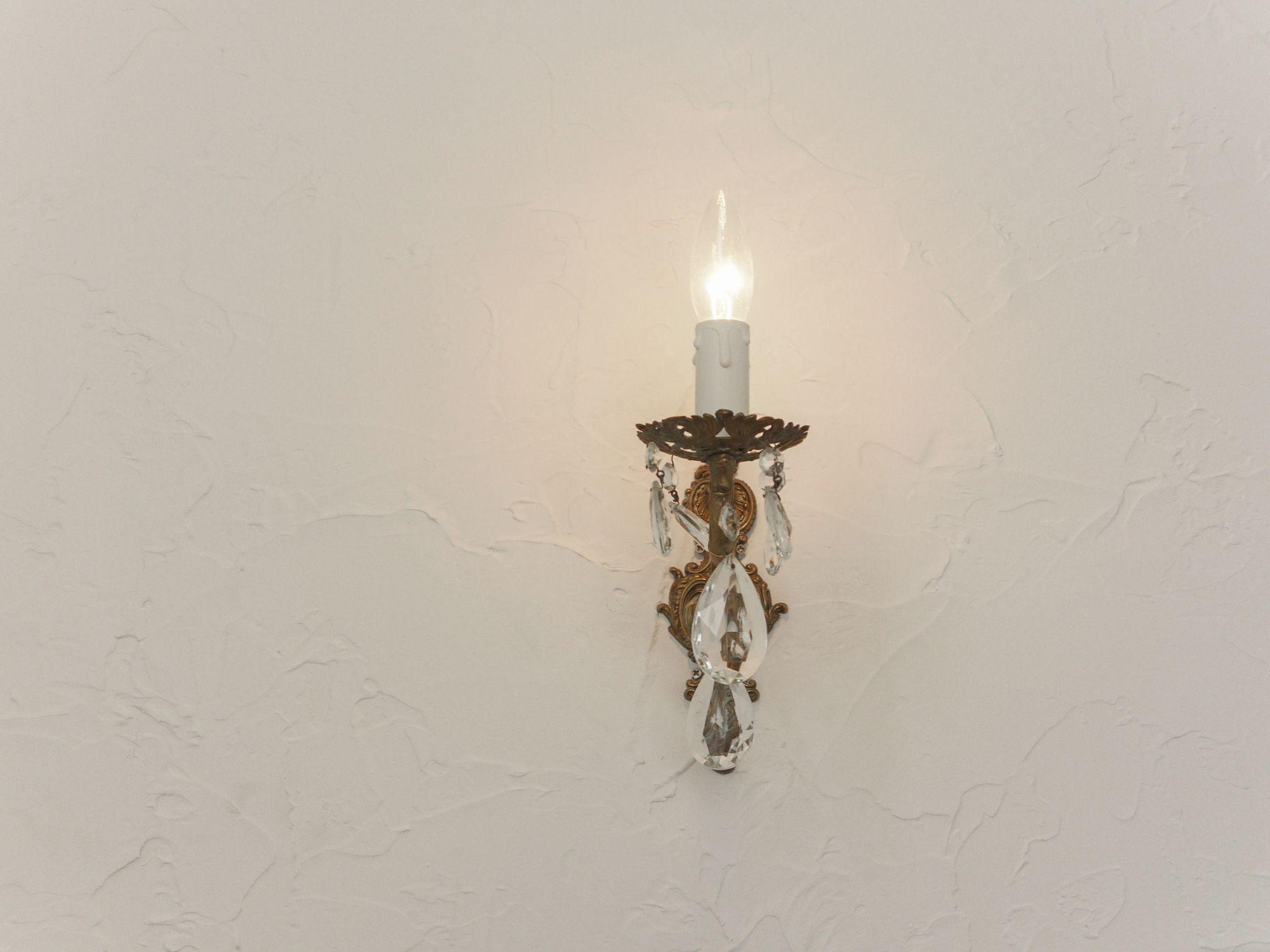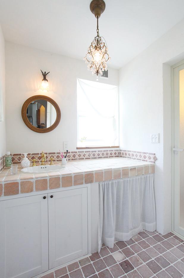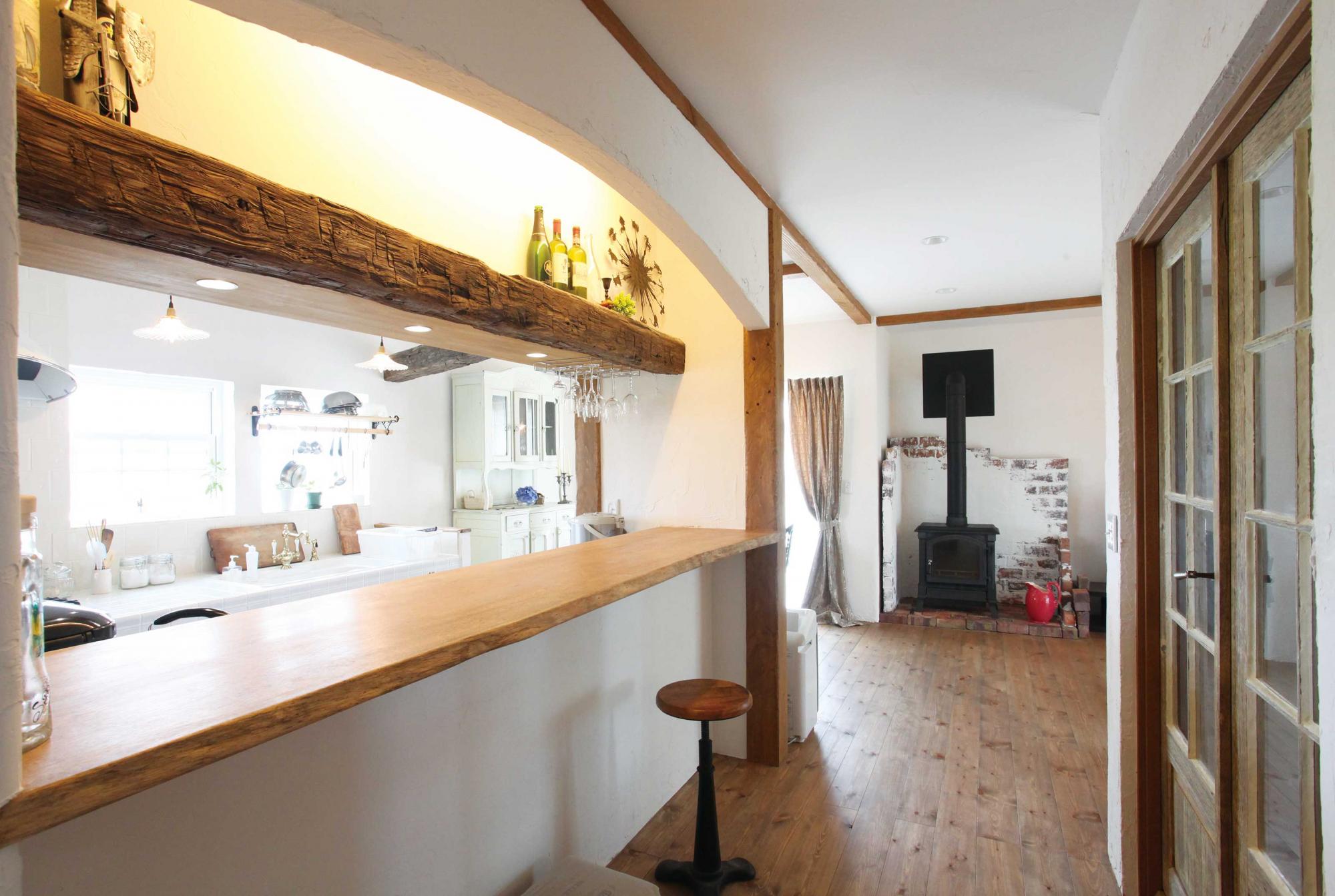 スペイン製のシャンデリア、フランス製のキャビネットなど、自分たちが愛する様々なアイテムを独自に購入し、インテリアをヨーロピアンテイストにコーディネート。また、タイルや木材、ドアや建具、ドアノブに至るまで、ヴィンテージ感のある材料を自らチョイス。さらに塗り壁もあえて「ダメージ感のある風合い」にこだわりオーナー様自らが手間ひまをかけて塗り込んだという。