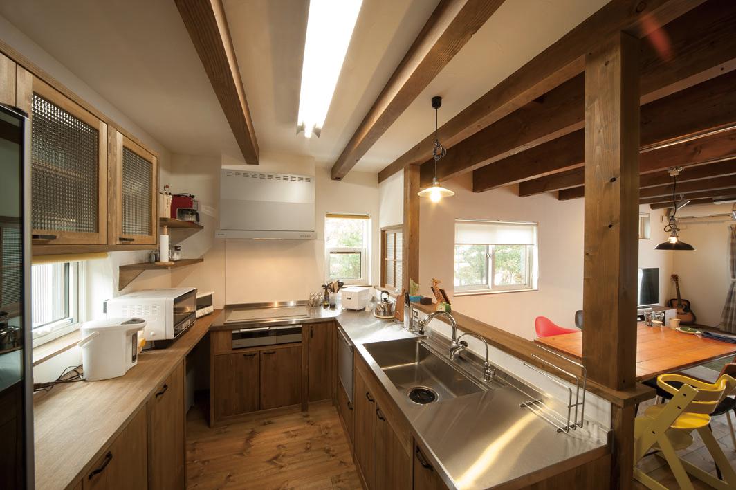 アメリカンテイストを好むオーナー様のご要望は、「ピカピカの新品」ではなく、「ユーズド感のある味わい深い家」。家づくりナビ本誌で見たイイタ建築を施工例にシンパシーを感じたご主人は、迷わず同社に夢を託したという。外観は、アメリカの「西部劇」を思わせるウッディーな玄関まわりが印象的。室内は、塗り壁や無垢材のフローリングなど、同社の持ち味であるナチュラル感はそのままに、独自の演出と表現力によって、まるで履きならしたデニムのようなヴィンテージっぽい空間に仕上がっている。さらに、ホームパーティーができる広いリビング、隠れ家的な書斎、家事ラクなコの字型キッチン、各種の造作家具や魅せる収納など、家族の「欲しい!」もすべて凝縮。