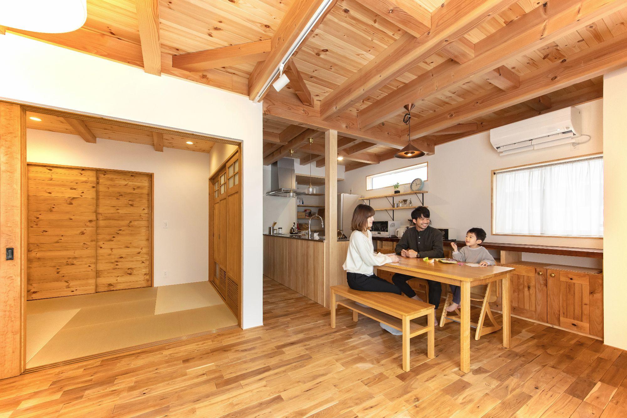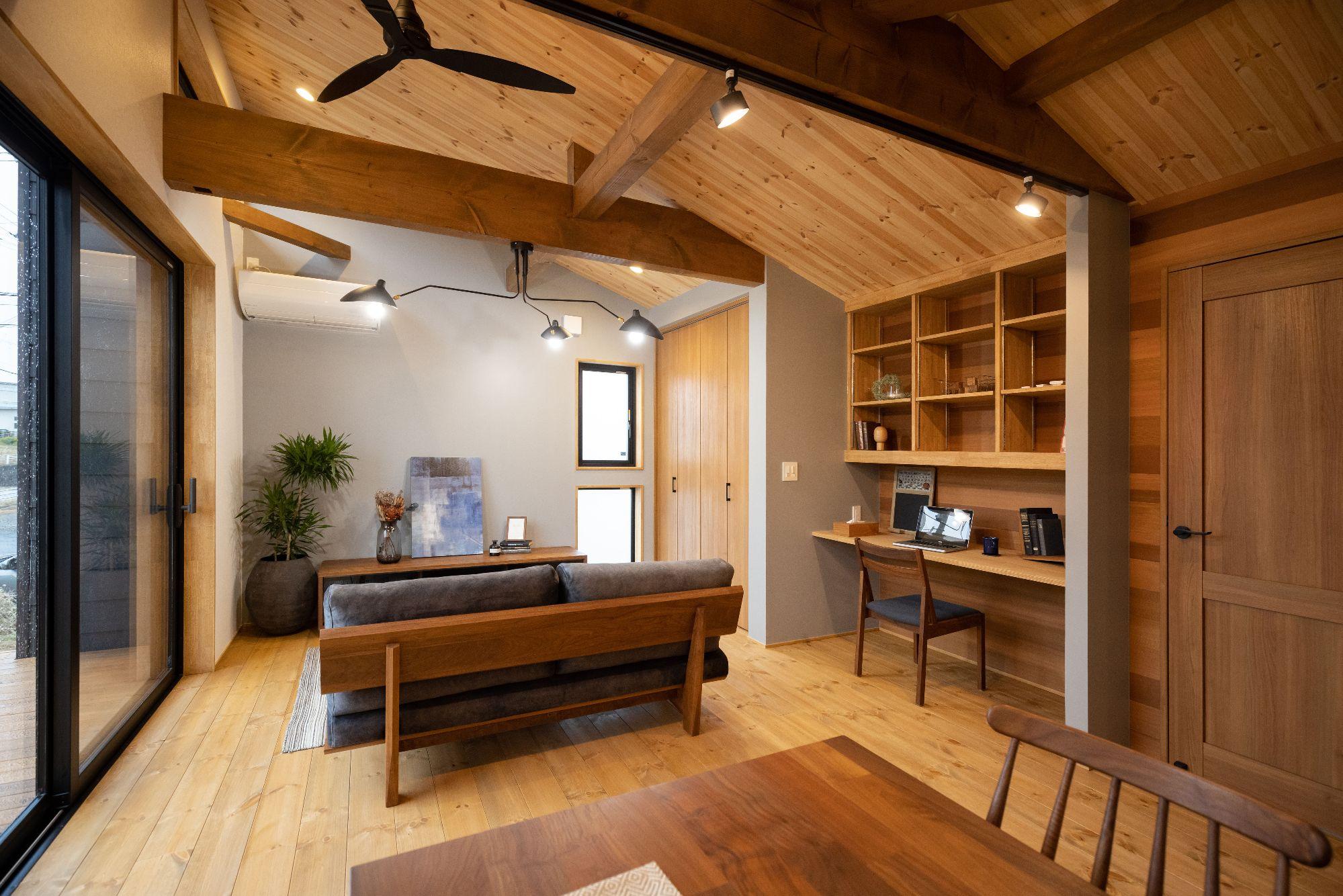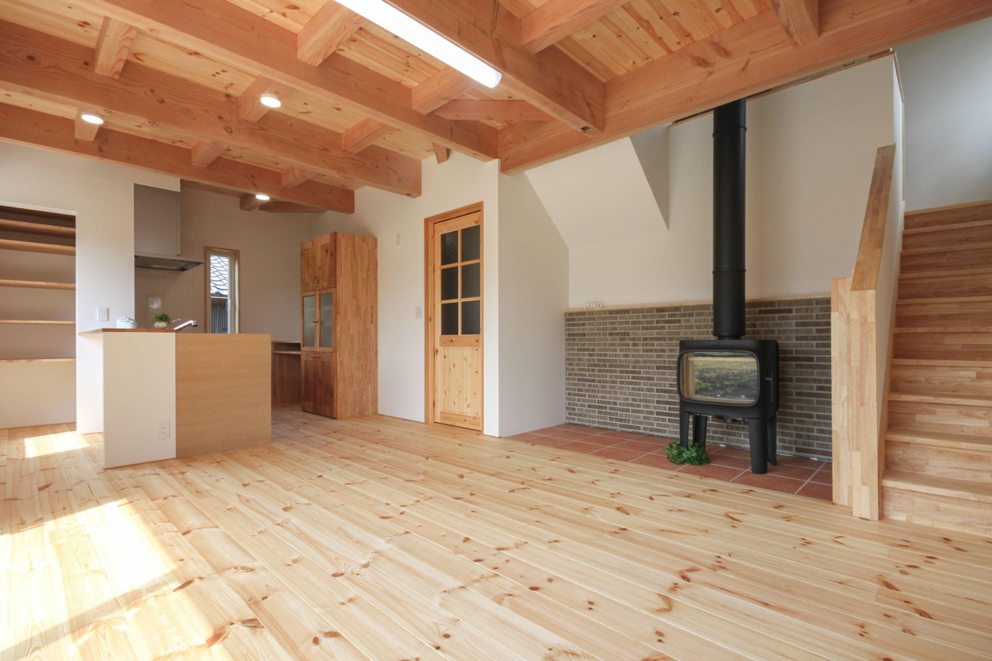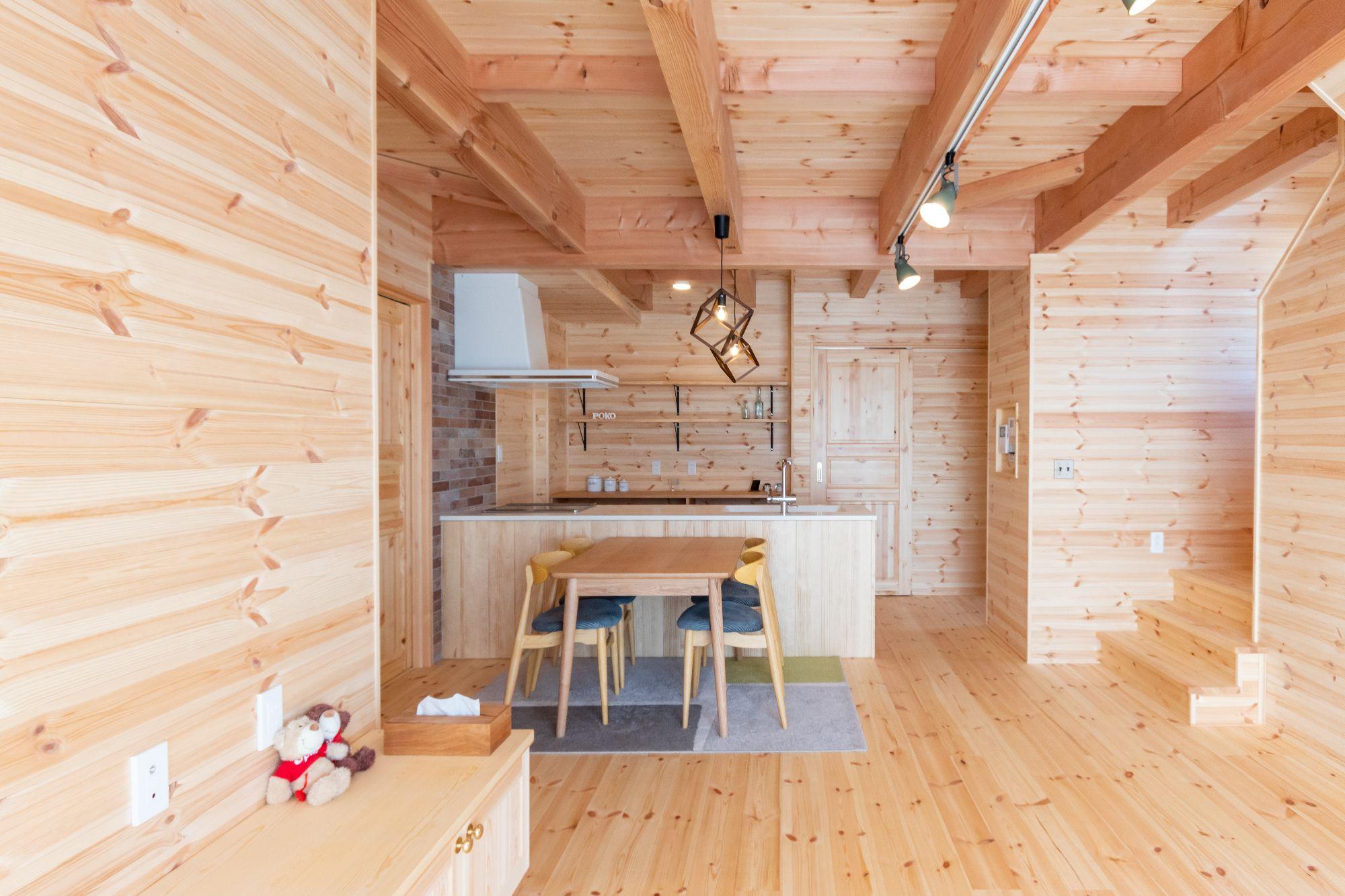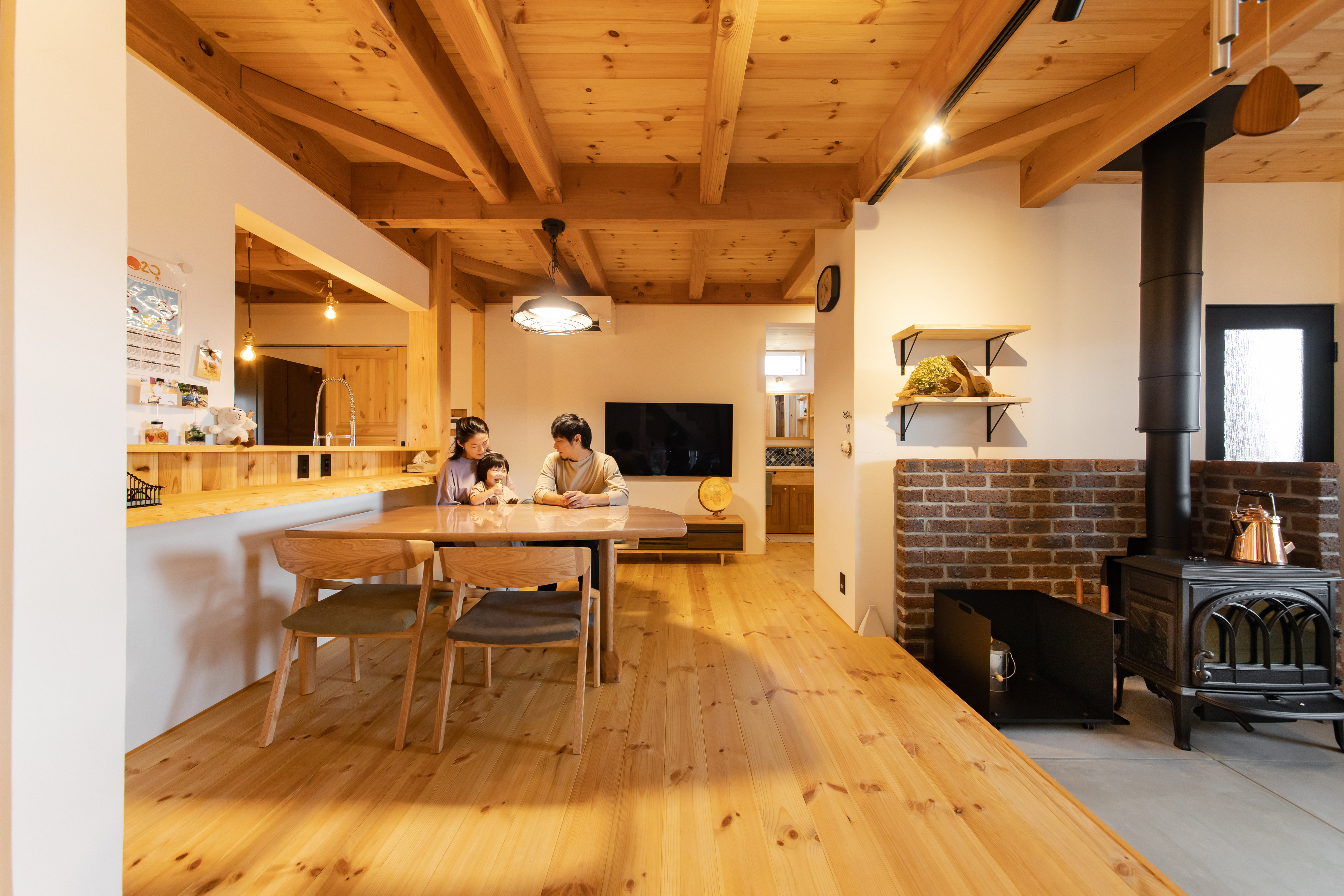 素足でも心地よく過ごせる無垢レッドパインのフロアや塗り壁を使っています。