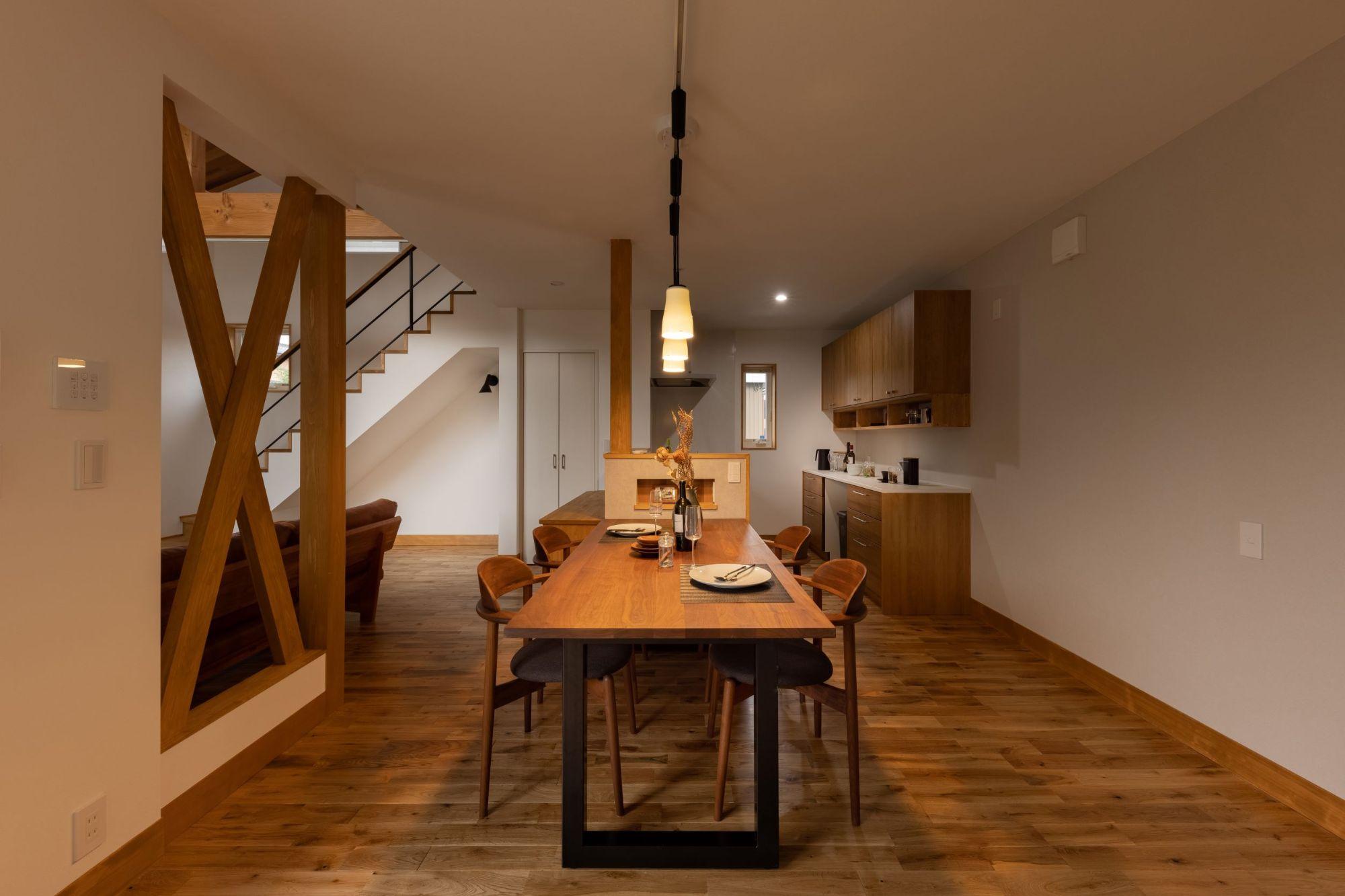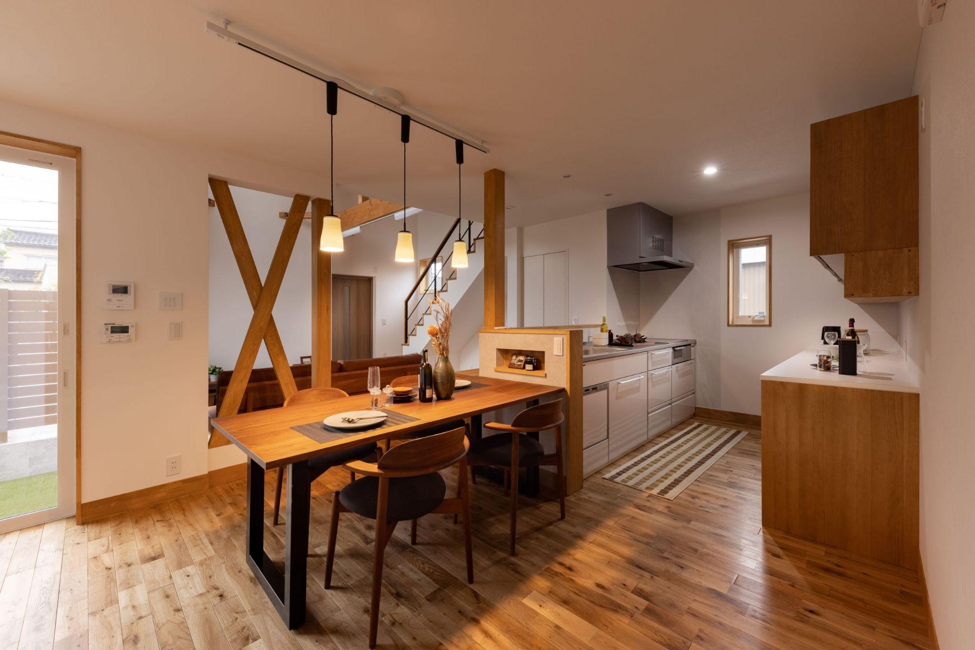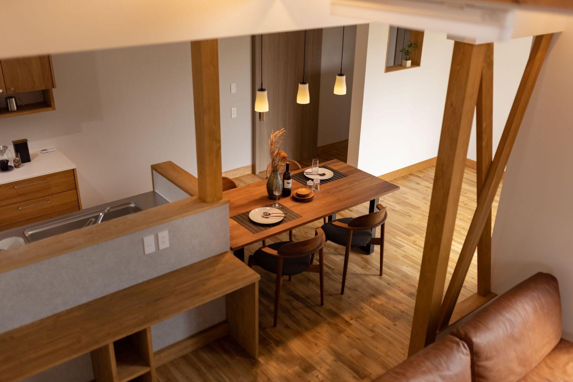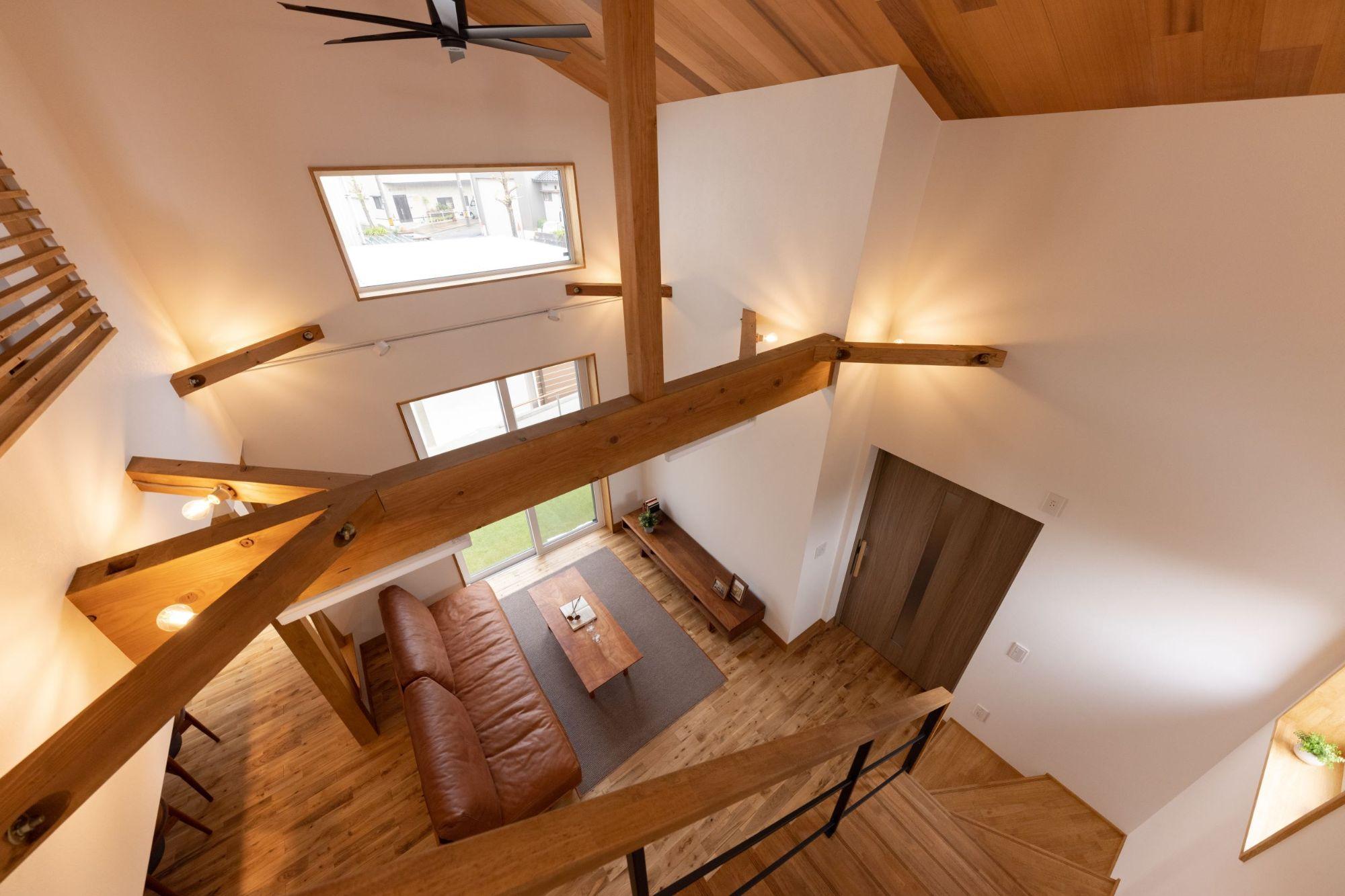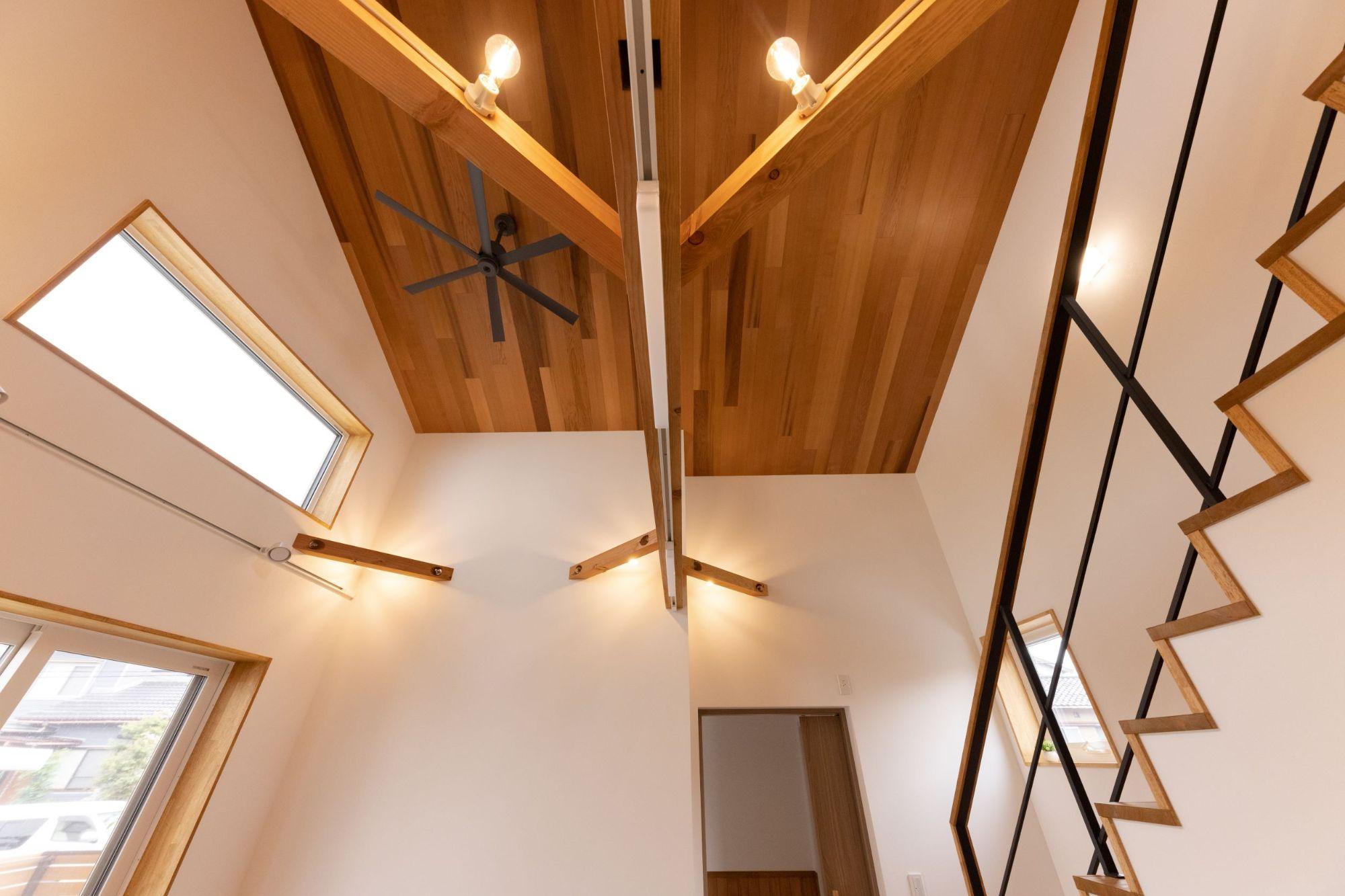 レッドシダーの板張り勾配天井・梁見せ・筋交い表しなどがおしゃれで開放感あふれる家に仕上がりました。