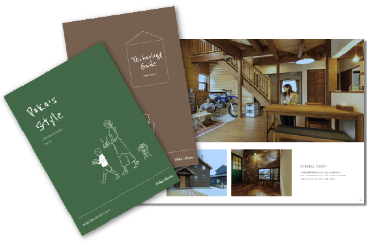 ポコ・ハウスのこだわりである「素材や性能」に関する数値やデータを示した資料や、こだわりの施工事例を集めた「暮らし」の事例集など、 家づくりのヒントになる資料をご用意しています。ぜひご活用ください。
